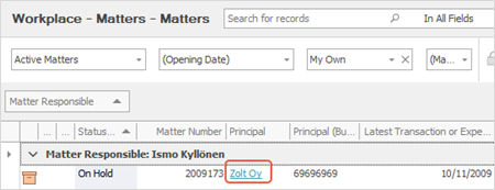 All underlined information on the lists functions as quick links to the respective information. For example, by clicking on the customer's name in the Matters list, you can directly open the customer window for the matter principal. If you want to open the window for the specific data row in the list, make sure that the mouse cursor is not on the link.