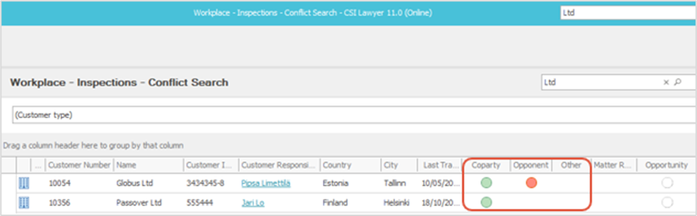 For each customer, it shows whether the customer has acted as a party, opponent, or in some other role in matters stored in the software, whether the customer has matter requests or sales opportunities, and whether the customer is possibly blacklisted. If the customer has been a principal in matters, the date of the latest transaction or expense entry is also shown.