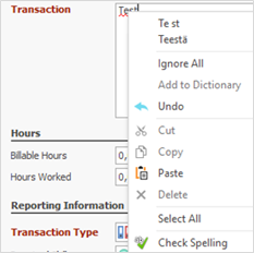 The software can enable grammar checking, e.g., for texts that have been entered in the following fields: matter subject, description and invoice subject, transaction subject and additional information, subject of expenses and activities, and free text of preliminary invoices and invoices.