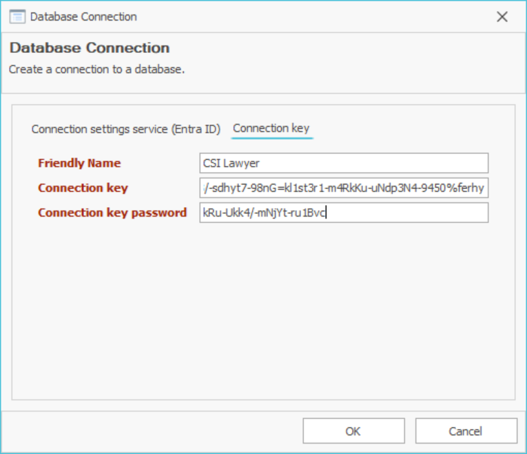 - Instruct the user to attach the connection key and its password from the e-mails to the CSI software's database connection window.