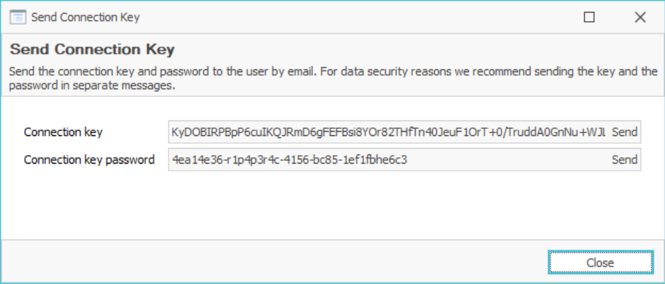- From the Send Connection Key window you can send the connection keu and its password. For security reason they are sent in separate e-mails