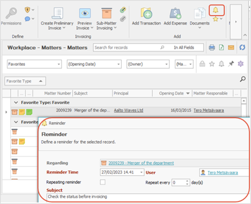 You can set reminders for yourself or another user related to customers, matters, transactions, invoices, etc. You add a reminder using the ribbon button by specifying the necessary details: when the reminder is activated, to whom it is sent, and the subject.