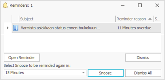 The reminder can be opened for review, postponed, or dismissed with the "Dismiss" button if the matter is already resolved. The reminder will reappear on the user's screen until it is dismissed, so it is advisable to set the reminder time to be relevant for the recipient. The number of activated reminders is also visible in the lower left corner of the software.