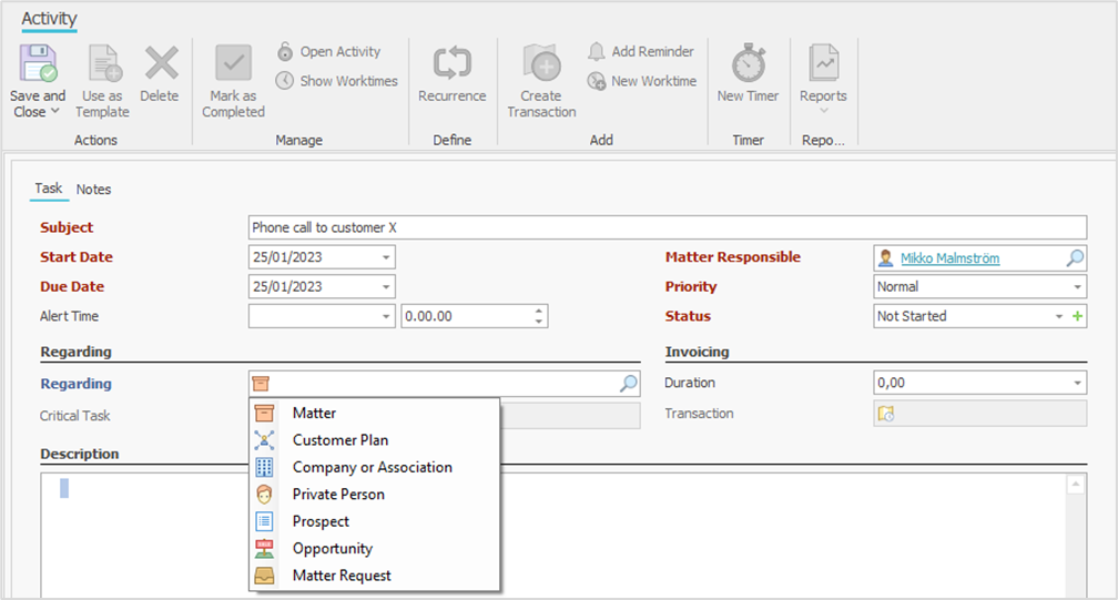 You add a new activity with the New button in the Activities folder of the Workspace area, in the customer window, or in the matter window, you can also select a previous activity as a template for the new one with the Use as template button. The default type of activity created with the New button is a task, but you can select another type for the new activity from the dropdown arrow on the button. The type can no longer be changed in the activity window.