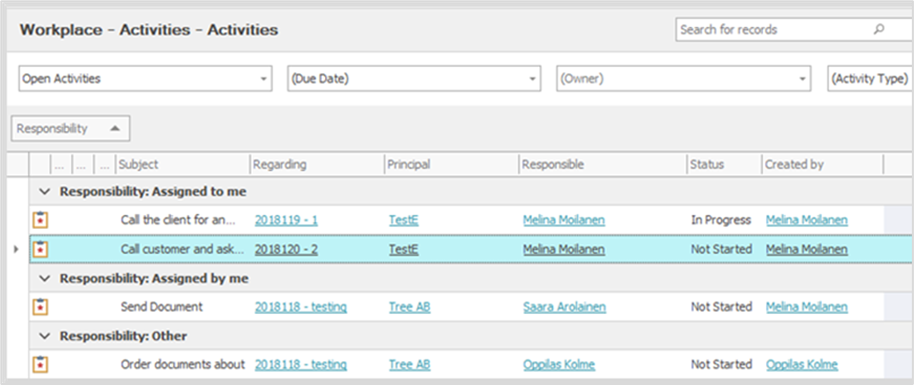 - The "Other" group lists the activities where you are neither the creator nor the responsible person for the activity.
