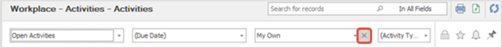By changing the view selection, you can view only the activities assigned to you, completed (passive) activities, or all activities. If not all view options are available, the power user may have restricted them.