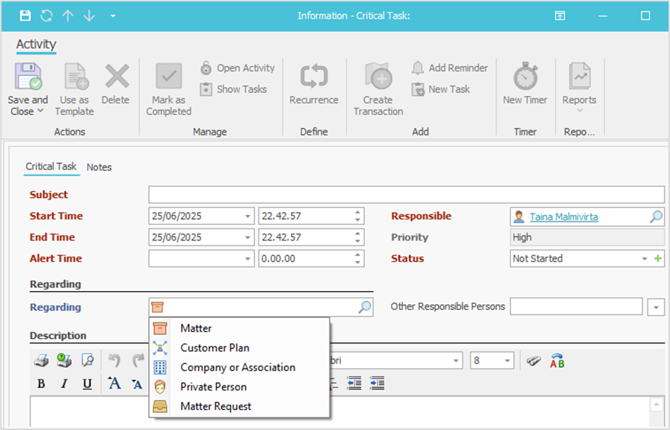 You can create a new critical task either in the Critical Task calendar or in the Activities folder by selecting a critical task as the activity type. If you add a critical task in the Activities folder, the critical task window differs slightly from the normal activity window: