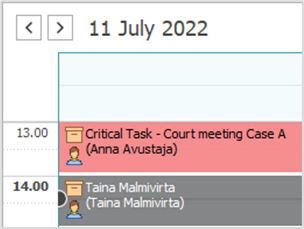 If your user type is "restricted user", the critical task calendar reservations will also be visible to you in a limited way. Critical task entries in the calendar appear in grey instead of red if you do not have the necessary rights for the critical task. You will only see the start and end times of the critical task and the name of the responsible person, and you cannot click on the critical task to open it or mark it as completed.