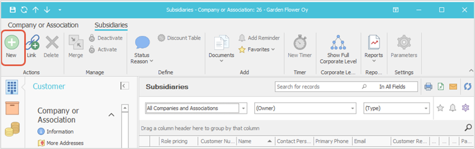 If a subsidiary needs to be created as new, you can add it directly in the parent company’s window under the Subsidiaries folder. The New button opens the window for creating the customer, and the Save button saves it as a subsidiary of the selected parent company.