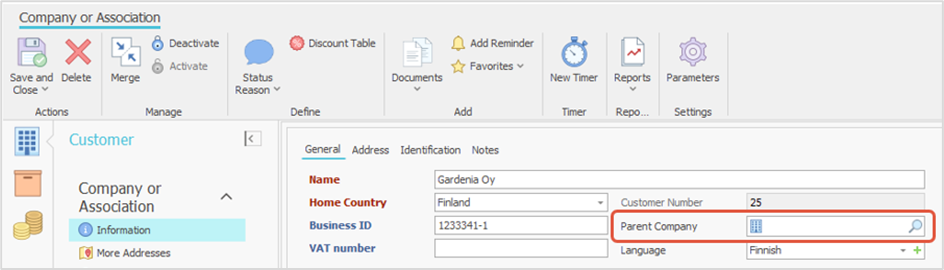 If the customer company to be linked as a subsidiary already exists in the software, the link can be created either in the parent company’s or the subsidiary’s details: