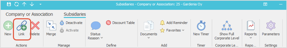 b) Alternatively, you can open the details of the company to be set as the parent, navigate to the Subsidiaries folder, and add the subsidiary using the Link button on the ribbon.