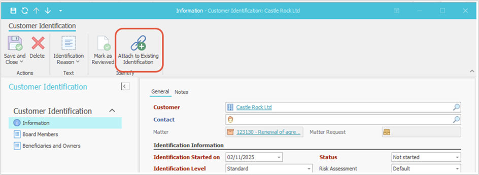 For identification, you may be able to use a customer’s previous identification event. If the customer already has a completed, sufficiently thorough, and still valid identification, its information can be copied to a new identification event. This facilitates handling identifications, for example, if the customer has several matters with the same risk level.