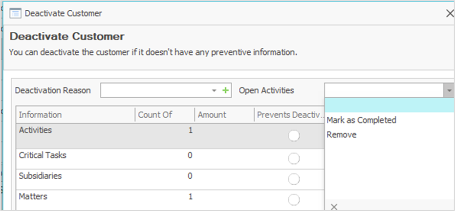 Open critical tasks always prevent deactivation. Other open activities can be marked as completed or deleted during the deactivation process.