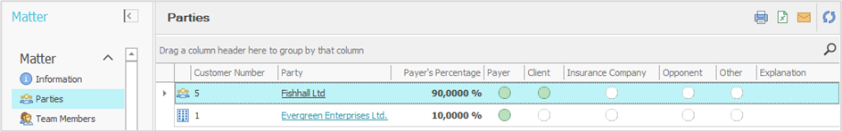 You can open a matter party from the list and add to it a matter-specific contact, customer reference, and invoicing contact to override customer-specific information.
