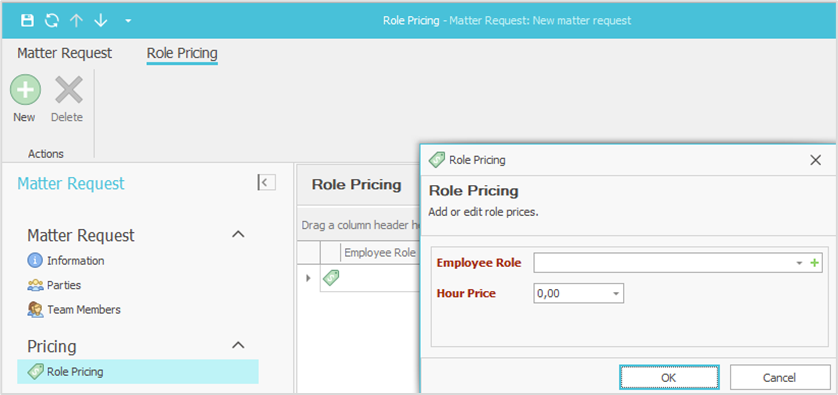The Role Pricing folder allows you to price transactions in the matter based on the user’s employee role. You can add matter-specific hour prices for roles defined in the software. If a role-based pricing model is in use and no general hour price is set for the matter, transactions entered in the matter will automatically get the hour price based on the role of the user recording the transaction.