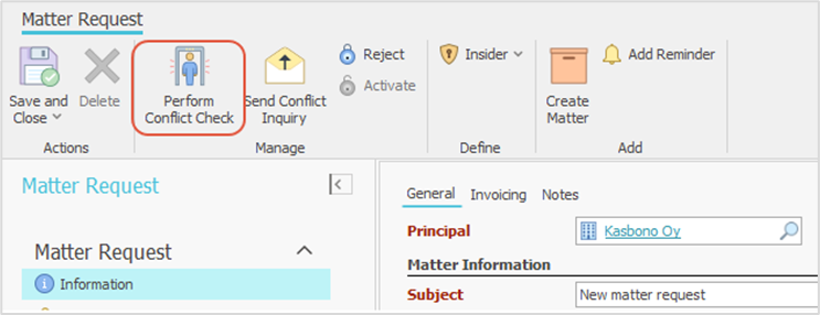 If billable work needs to be done at the matter request stage, it can be recorded in the Transactions folder. Entries saved in the matter request are also transferred to the matter created from it.