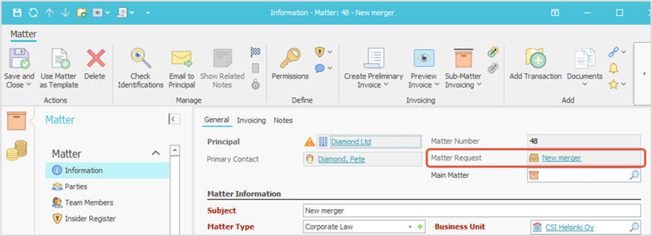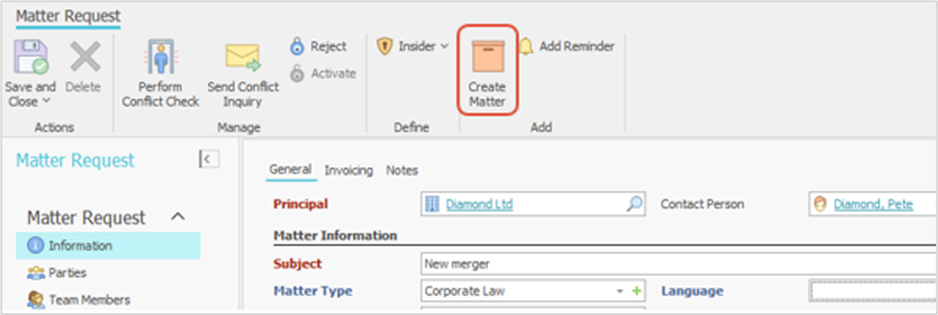 Once all necessary information has been collected in the matter request and there are no obstacles to accepting the matter, you can convert the matter request into a matter using the “Create Matter” button. The button is found in the ribbon of the individual matter request and in the Matter Requests folder in the Workspace area.