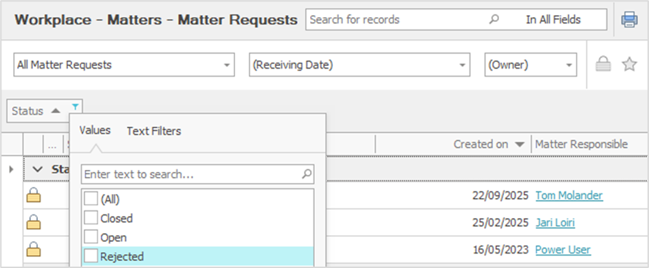 If the matter cannot be accepted, you can reject the matter request by selecting the “Reject” button from the matter request list or window ribbon. Rejected matter requests can be viewed in the All Matter Requests view by selecting “Rejected” as the filter.