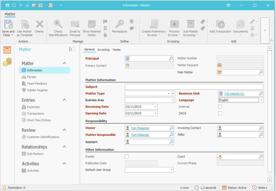 A new matter is created either in the Workspace area’s Matters folder or in the customer’s information. By default, all users have the right to open new matters, but the power user can restrict this right to specific user groups.