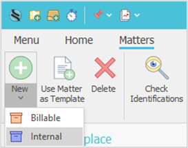 Internal matters are used to coordinate and track administrative work that is not related to billable matters. An internal matter can be either an ongoing administrative or marketing matter, or a one-off project that needs to be coordinated through activities and for which you want to track the amount of work performed.