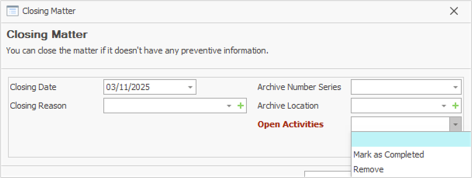 Matters can also be closed in bulk, as long as all selected matters belong to the same business unit. When you select matters from the Matters list and click the Close button on the ribbon, you can enter closing information in the window that opens and choose how to handle open activities related to the matters. They can either be marked as completed or removed.