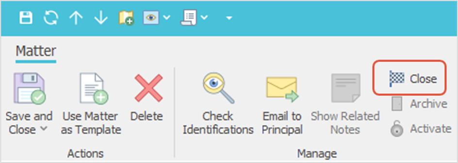 When a matter is complete and all work has been invoiced and payments processed, you can close the matter by selecting Close from the ribbon in the matter window.