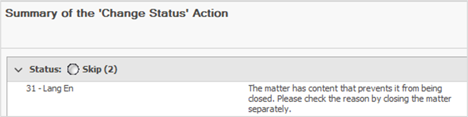 If a particular matter cannot be closed in bulk, it will appear on the error list and you will be prompted to close it separately.