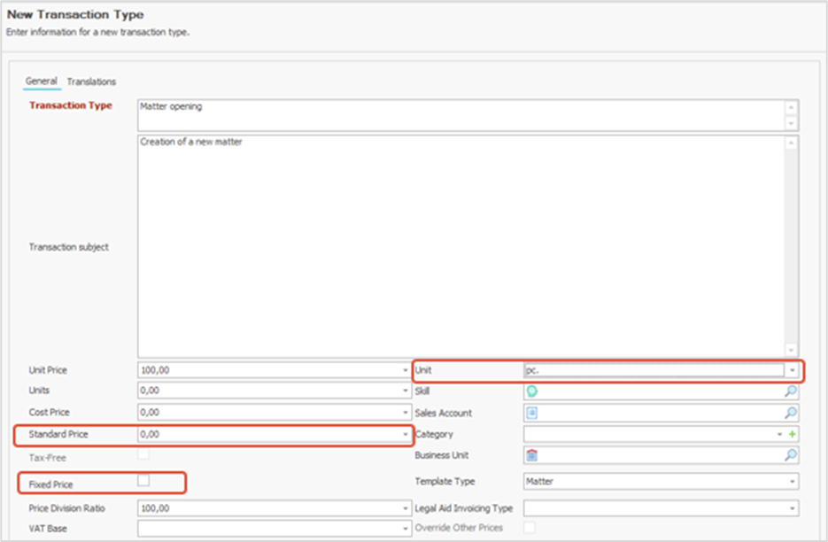A fixed‑priced transaction type, for example the opening of a matter, always produces a certain fixed amount as the transaction price. Any price adjustment or discounts made during the invoicing phase do not affect a fixed‑priced transaction.