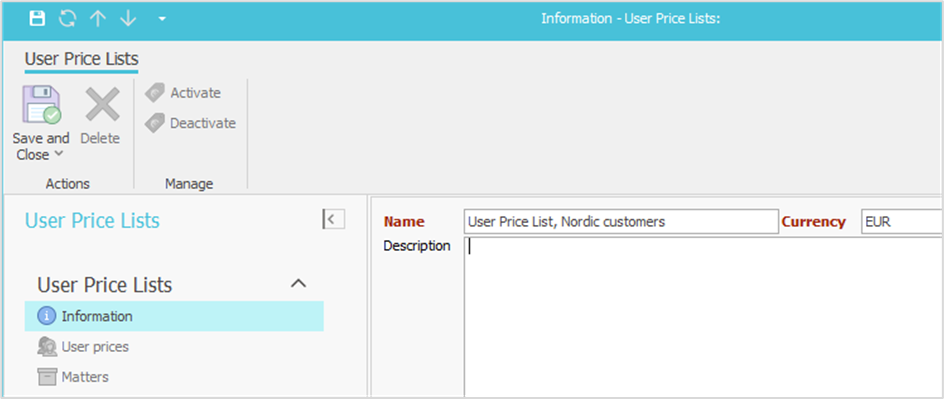 The Matters folder in the window lists all matters whose parameters (Invoicing > Pricing > User Price List) have this user price list selected. The price list must always match the matter’s currency.