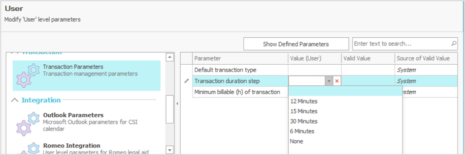 A minimum duration can also be set for a transaction at the following levels, from weakest to strongest: 1) business unit, 2) user, 3) customer, and 4) matter. This setting is also defined in the parameters of each level