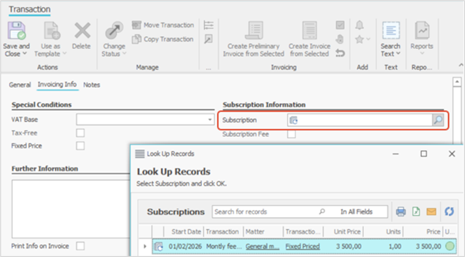- If you are recording a transaction on a matter with a subscription price, you can include the transaction in the subscription by selecting it in the Subscription field. Click the magnifying‑glass icon and choose the subscription from the list. The transaction will then appear on the invoice with a zero price.