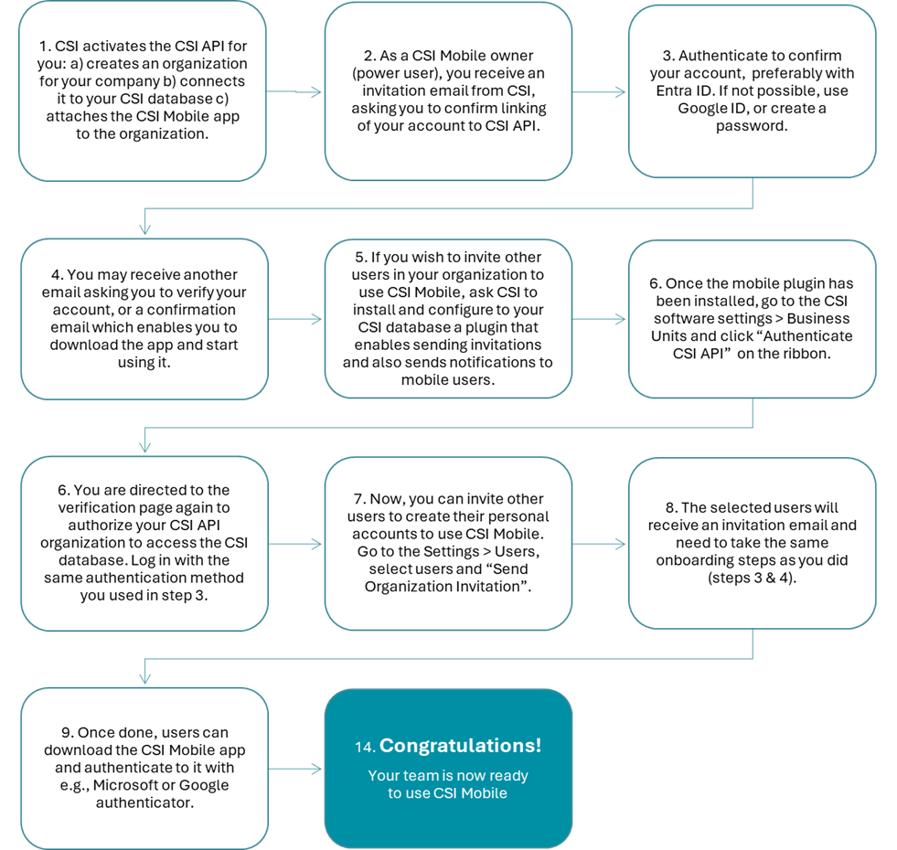 After that, you as a power user need to take the following steps to finish the API deployment, to get CSI Mobile into your own use and to be able to invite your colleagues to use CSI Mobile.