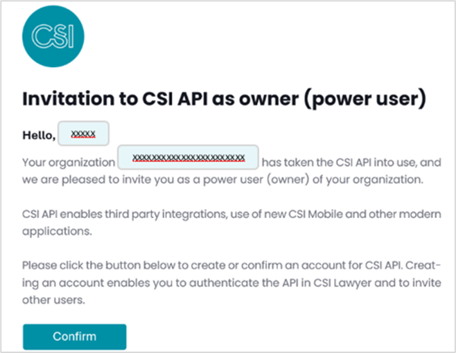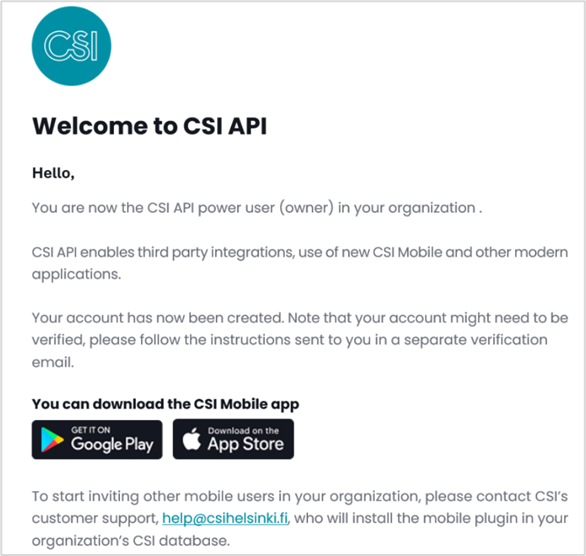 You will receive a welcome email from no-reply@csihelsinki.app, asking you to confirm your account for CSI API.