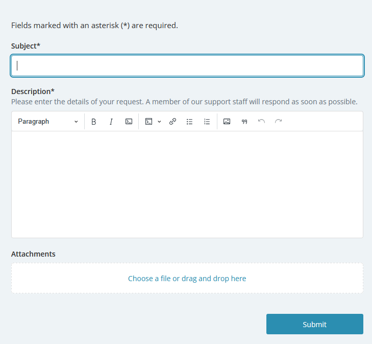 In addition to the subject, the form includes a Description field for describing your support request. We kindly ask you to provide as precise a description as possible of the assistance you need. Here you can find instructions on what information helps us process your request faster. You may also add attachments to your support request if you wish.