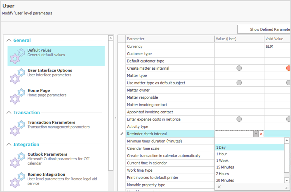 The software will open directly to the Defaults parameter folder, where you can define your user‑specific reminder check interval.