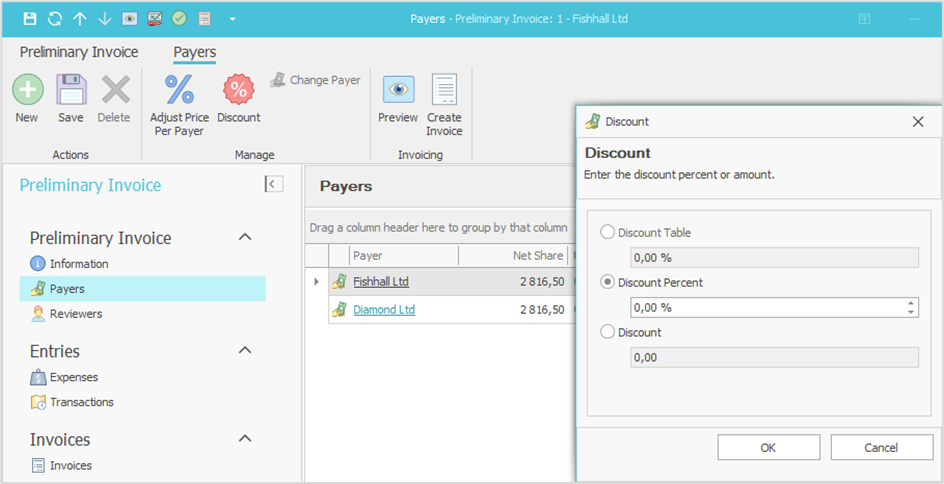 At the invoice level, the discount is applied in the preliminary invoice’s Payers folder by selecting the payer row and choosing Discount from the ribbon, which opens the discount window.