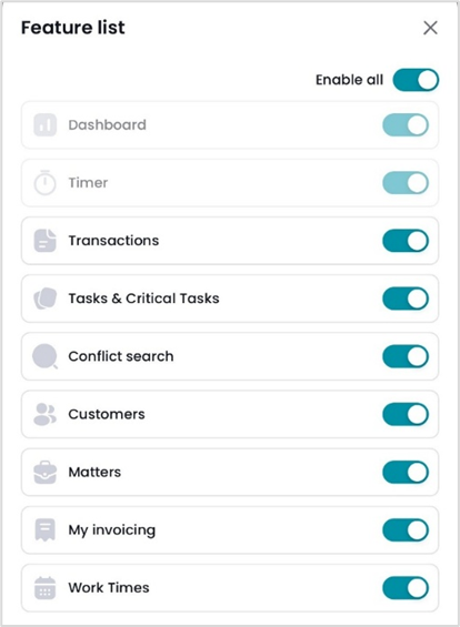 Restricted users have no access to the My invoicing and Conflict search features, but can enable/disable the Customers, Matters, Transactions, Task, Critical tasks, and Work times features.