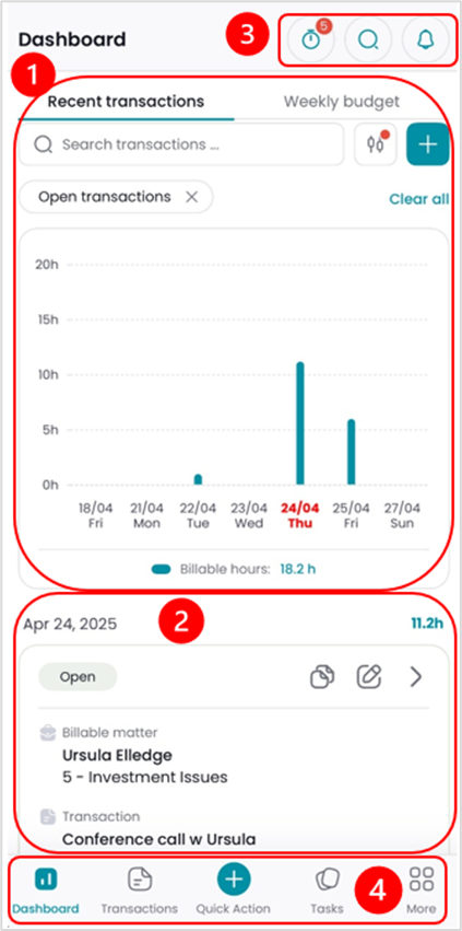 - “Recent Transactions” shows the total billable hours of your transactions in the past 5 working days (Monday to Friday). If you have recorded transactions for the weekend, those days are included in the 5 visible days. You can search for transactions within the displayed timeframe.