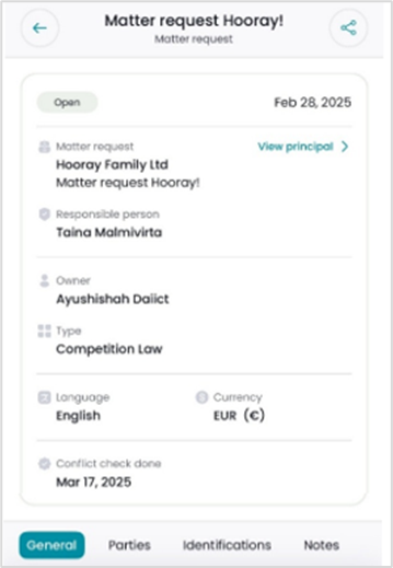 The screen allows you to view further details of the matter principal as well as the matter request related parties, identifications, and notes.