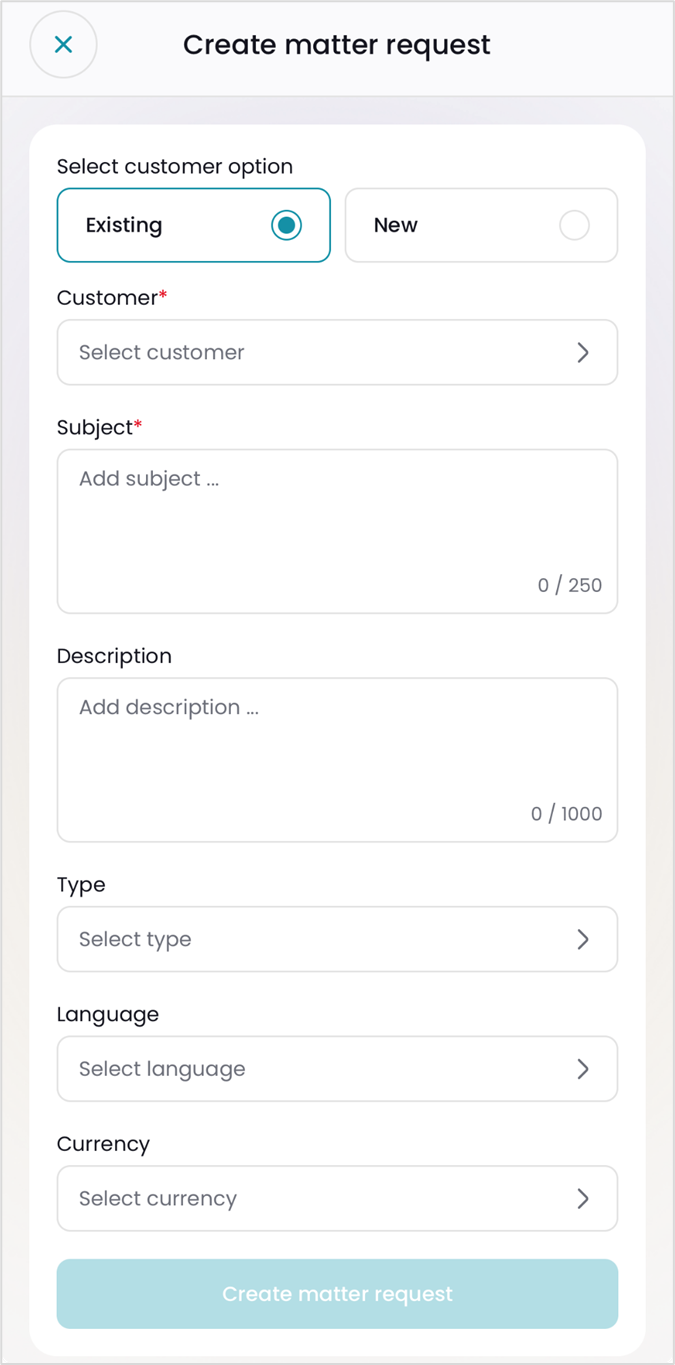 Once a customer has been selected or a new customer created, the customer is added to the matter request. You can then add a subject and a more detailed description, select the matter type, language, and matter currency. Once the information has been entered, you can save the matter request using the "Create matter request" button.