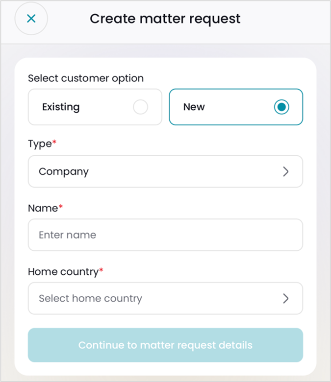 You can add either an existing customer as the principal for the matter request, or create a completely new corporate customer or private person.