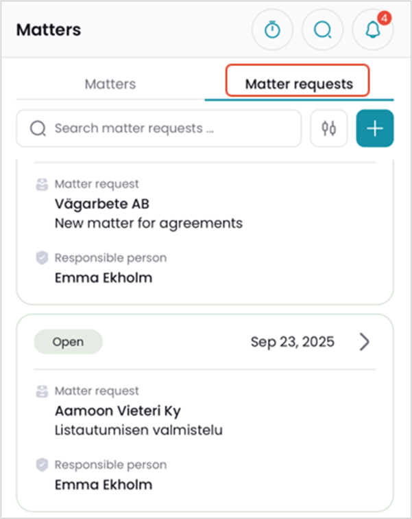 For each matter request, the app displays its status (open), creation date, principal, subject, and the user responsible for the matter request.
