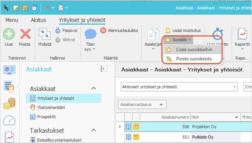Voit asettaa yksittäisen asiakkaan, toimeksiannon tai toimenpiteen suosikiksi valintanauhan -painikkeesta tai hiiren oikealla painikkeella aukeavasta valikosta.