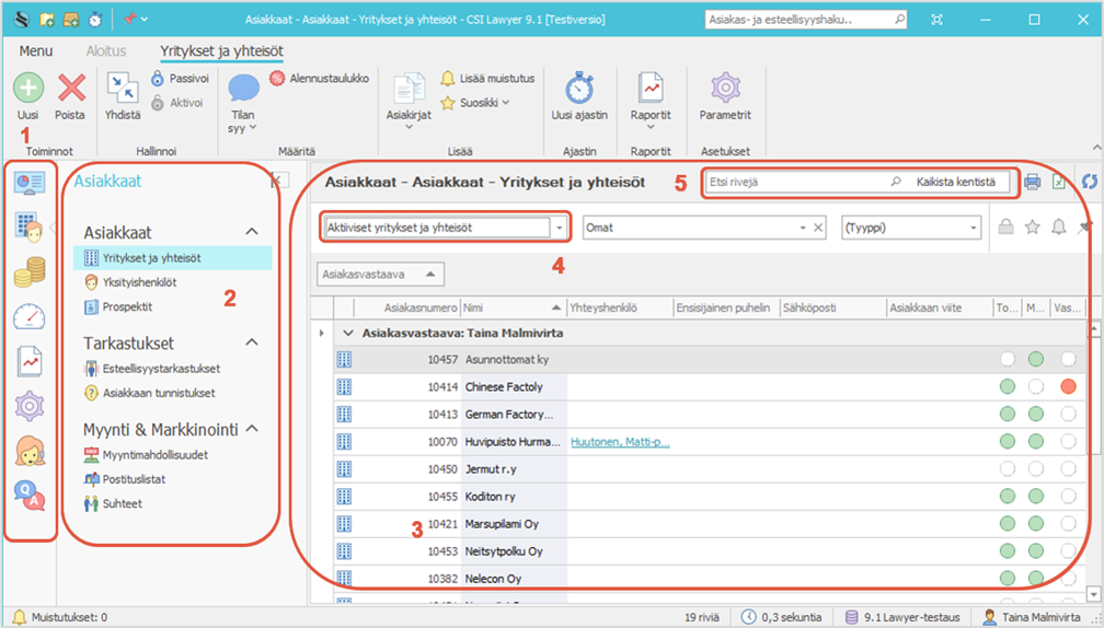 - Jokaiseen kansioon on määritetty valmiita näkymiä (4) ja niiden suodatuksia. Tässä näkymänä on Aktiiviset yritykset ja yhteisöt ja sen suodatuksena "Omat".
