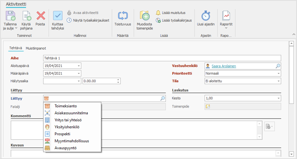 - Liittyy-kenttään voit valita esim. asiakkaan, avauspyynnön tai toimeksiannon, jota aktiviteetti koskee. Jos aktiviteetti on liitetty toiseen, fataljityyppiseen aktiviteettiin, linkki näkyy Fatalji-kentässä.