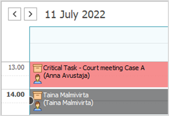 Fataljimerkinnät kalenterissa näkyvät harmaina eivätkä punaisina, mikäli sinulla ei ole fataljiin tarvittavia oikeuksia. Näet pelkästään fataljin alkamis- ja päättymisajan sekä vastuuhenkilön nimen etkä voi klikata fataljia auki tai merkitä sitä tehdyksi.
