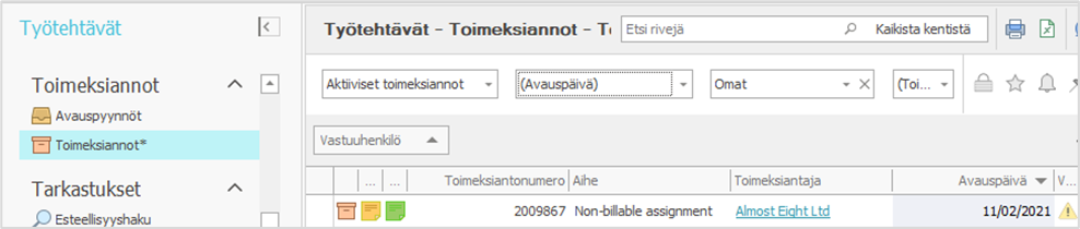 - Toimeksiannot-kansiossa keltainen kuvake Muistiinpanoja-sarakkeessa kertoo toimeksiantoon lisätyistä muistiinpanoista ja vihreä kuvake ”Asiakkaalla on tärkeitä muistiinpanoja” -sarakkeessa toimeksiantajalla olevista tärkeistä muistiinpanoista.