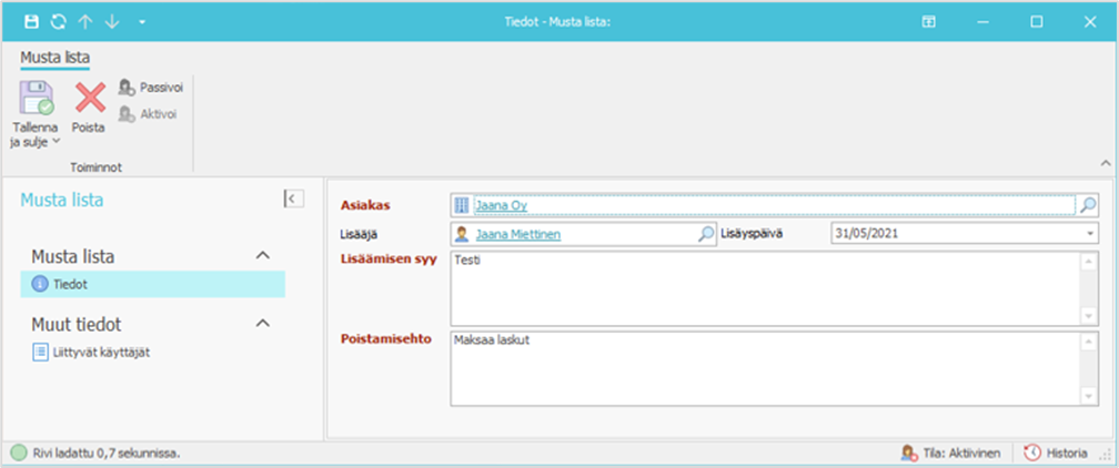 Jos asiakas halutaan kokonaan pois mustalta listalta, tapahtumaan liitetyt käyttäjät on poistettava ensin. Mustalistaus-merkintä voidaan kuitenkin poistaa käytöstä tallentamalla sen poistamisen syy. Merkintä poistuu silloin esim. esteellisyyshaun listauksesta. Mustalistauksen Lisäämisen syy, Poistamisehto- ja Poistamisen syy -kenttien enimmäismerkkimäärä on 200.