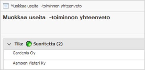- Toiminnon suorittamisen jälkeen yhteenvetoikkuna näyttää, onnistuiko muokkaus, ja voit halutessasi avata yksittäisen rivin tiedot riviä tuplaklikkaamalla.