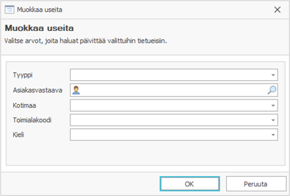 - Täydennä Muokkaa useita -ikkunaan tiedot, jotka haluat päivittää kaikille valitsemillesi asiakkaille: